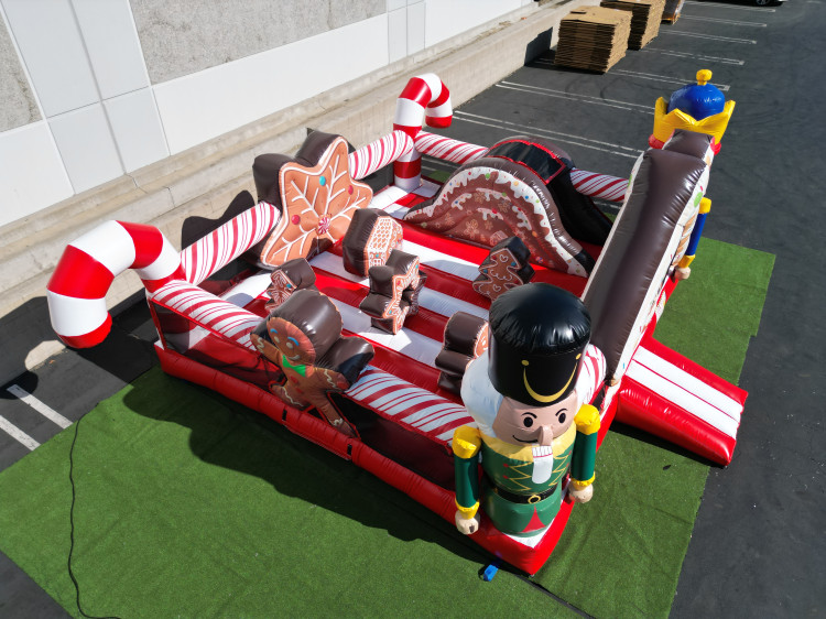 Gingerbread Playland — a festive, life-sized gingerbread bounce house attraction that brings holiday magic to school events, winter festivals, and Christmas parties. Bright candy-cane columns and colorful candy graphics create a cheerful, seasonal look that delights kids and draws smiles from adults. Built for younger children, the playland includes a small slide, pop-up obstacles, and open play areas for climbing, crawling, and imaginative play. Ideal for holiday gatherings looking to add a playful, photo-ready centerpiece that keeps kids entertained.